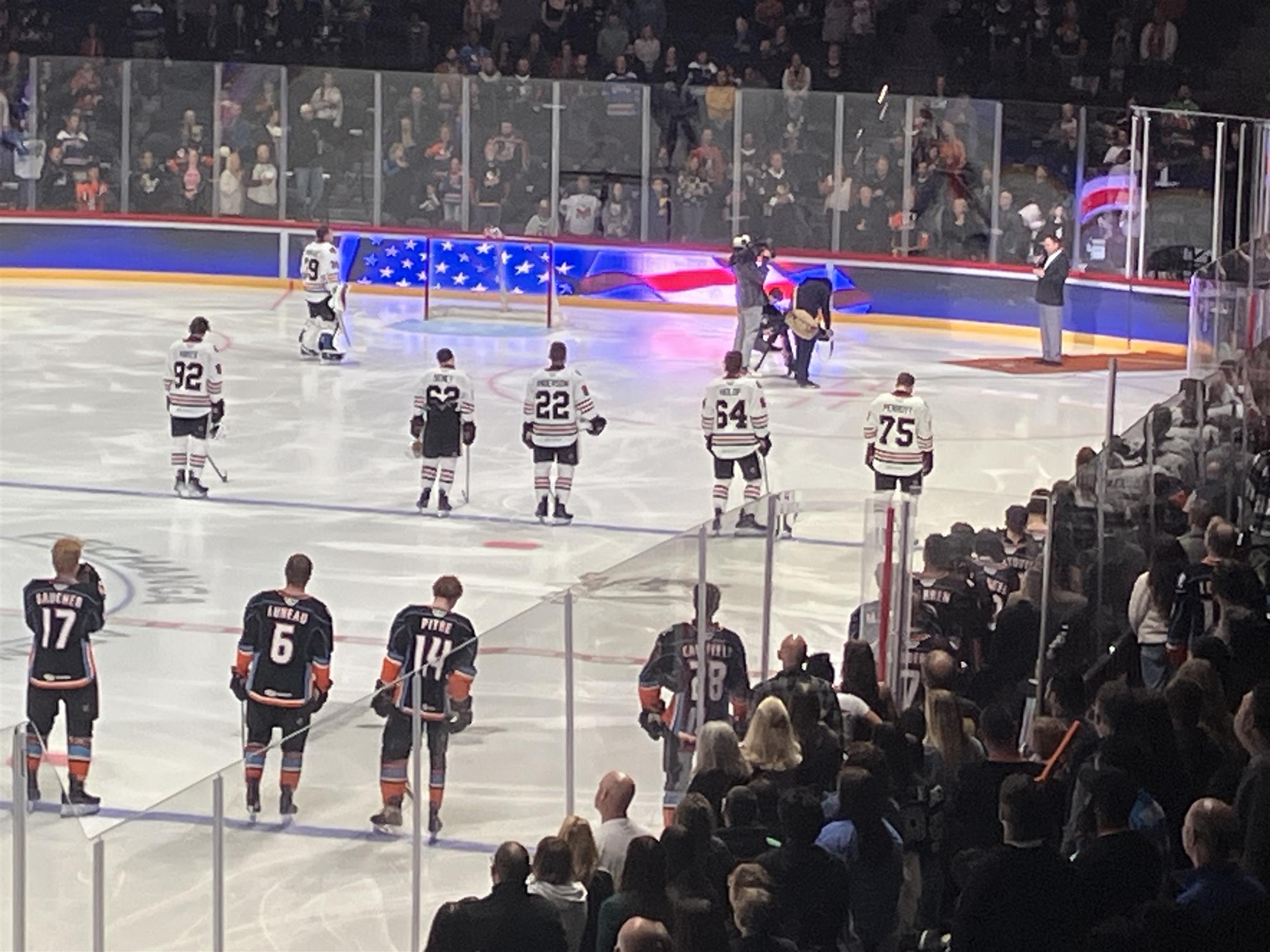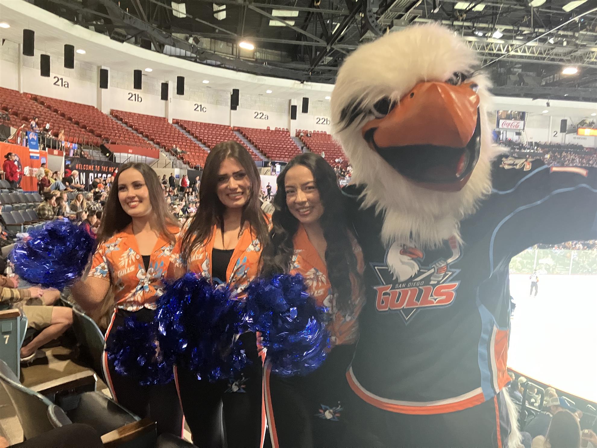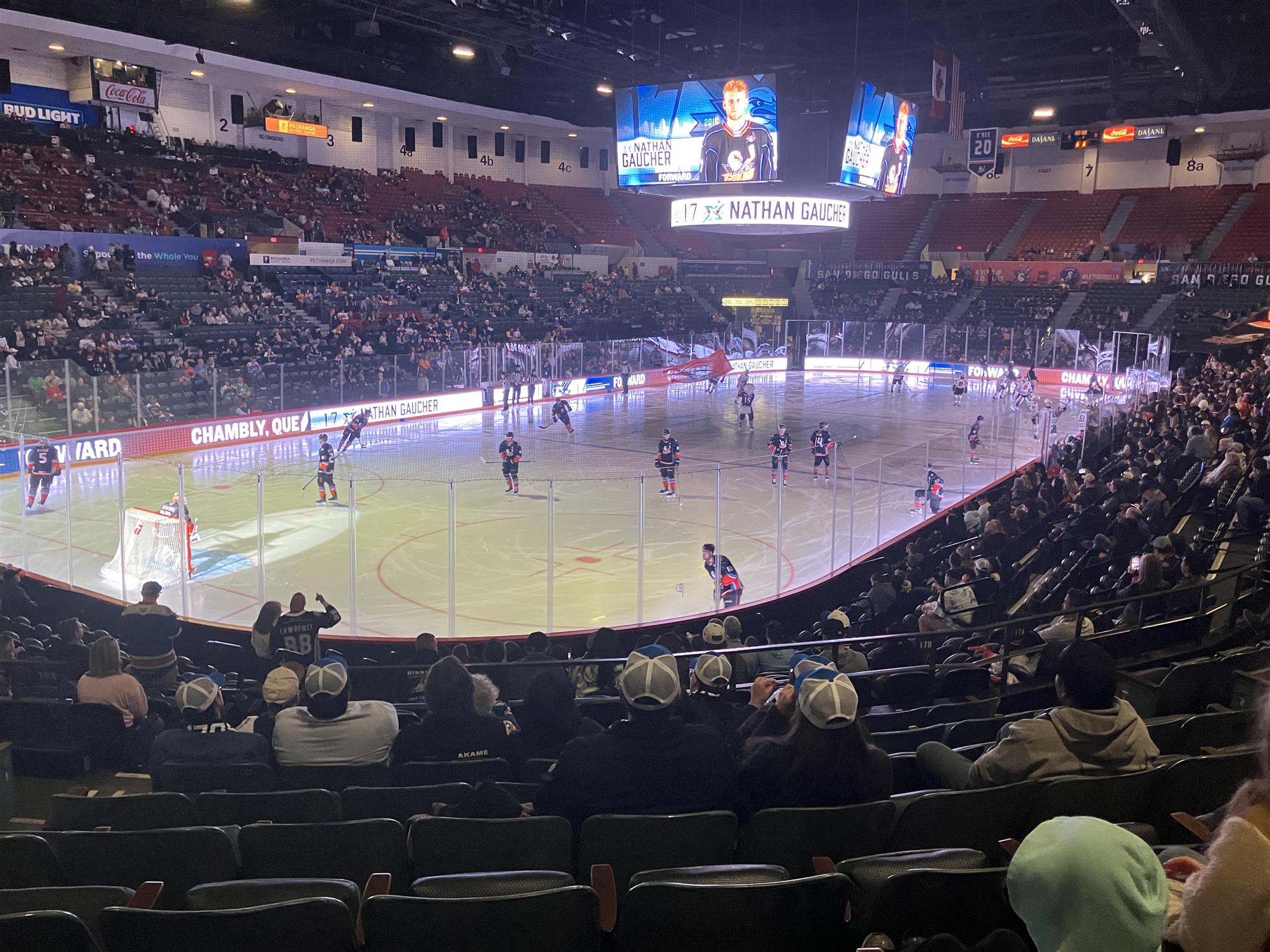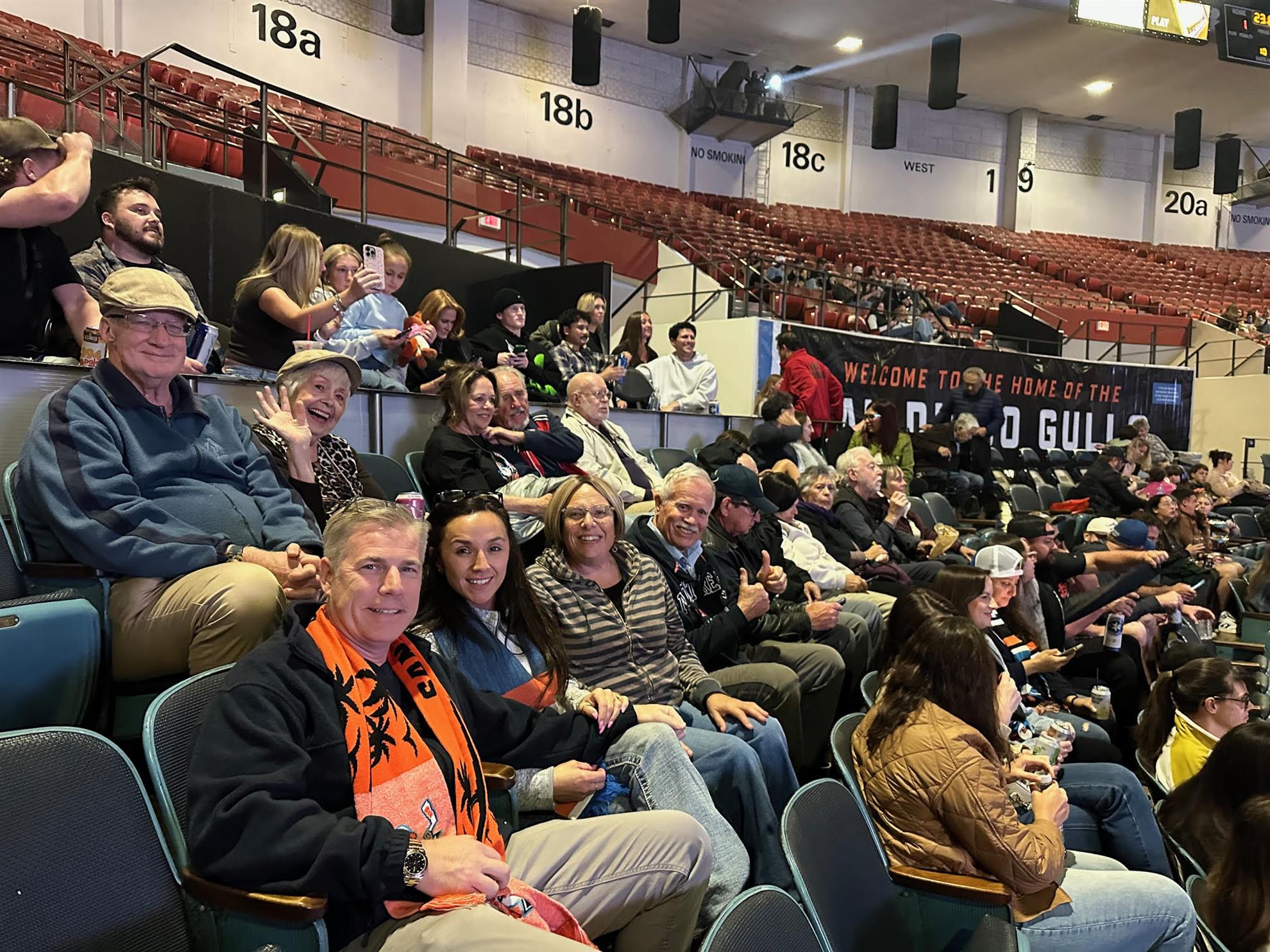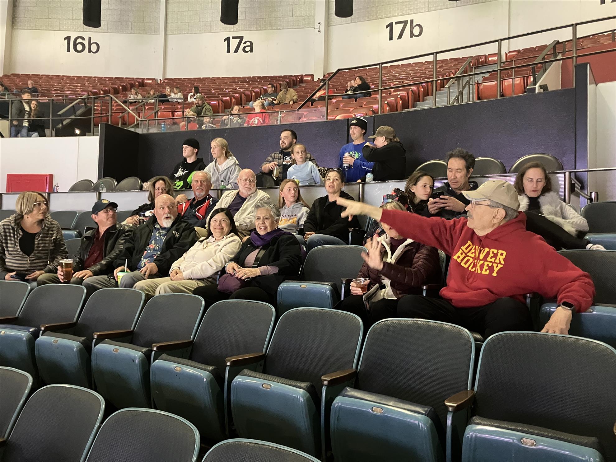 Frank (<---far right) is no doubt pointing to Kay (far left, front row) as being the mover and shaker who made this Rotary outing possible. As a former hockey player, Frank provided ringside commentary about the finer points of the game.