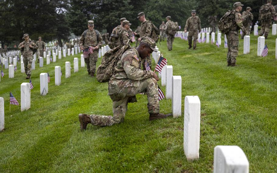 Per Eric Kayne's Stars and Stripes coverage, "Every headstone tells a story:" Army’s Old Guard places 260,000 flags at Arlington Cemetery ahead of Memorial Day. The above Stars and Stripes photo captures members of the 3rd U.S. Infantry Regiment, also