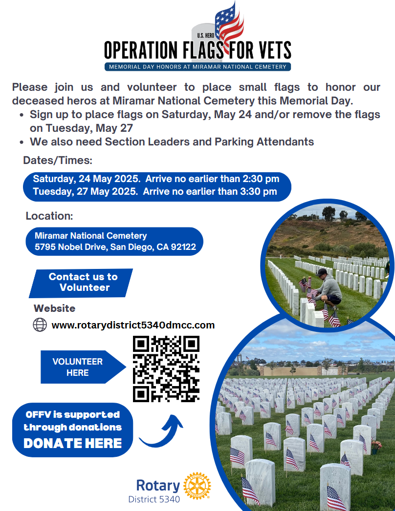 PLRC members supported District 5340's participation in the annual/national Flags for Vets Day. The District Military Coordination Committee (DMCC) conducted its Second Annual Operation Flags for Veterans on Saturday May 24th, 2025 at Miramar National Cemetery. This was the first annual American flag placement at that venue. Volunteers from various Rotary clubs honored our fallen heroes by placing flags at its 22,000 headstones. The flag pickup date was May 27th.
